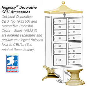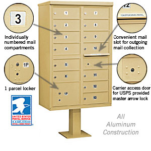 These units are officially licensed and authorized by the U.S. Postal Service. Ideal for commercial and residential developments and many other applications, CBU's are made of heavy duty aluminum and stainless steel hardware. Each aluminum door includes a heavy duty five (5) pin cylinder cam lock with a dust/rain shield and three (3) keys. One additional compartment in each unit is labeled "Outgoing Mail" and includes a weather protection flap and an 11-1/2" W x 3/4" H mail slot. Each unit includes one fully integrated parcel locker.