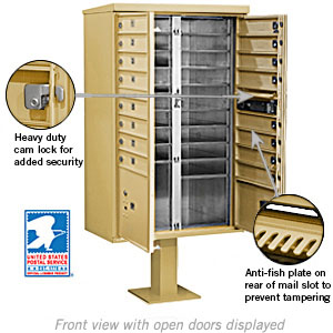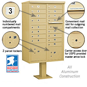 These units are officially licensed and authorized by the U.S. Postal Service. Ideal for commercial and residential developments and many other applications, CBU's are made of heavy duty aluminum and stainless steel hardware. Each aluminum door includes a heavy duty five (5) pin cylinder cam lock with a dust/rain shield and three (3) keys. One additional compartment in each unit is labeled "Outgoing Mail" and includes a weather protection flap and an 11-1/2" W x 3/4" H mail slot. Each unit includes two fully integrated parcel lockers.