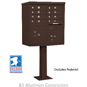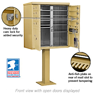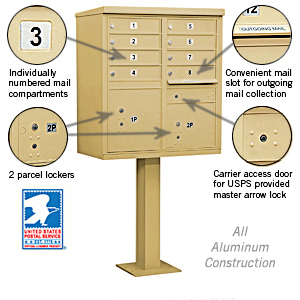These units are officially licensed and authorized by the U.S. Postal Service. Ideal for commercial and residential developments and many other applications, CBU's are made of heavy duty aluminum and stainless steel hardware. Each aluminum door includes a heavy duty five (5) pin cylinder cam lock with a dust/rain shield and three (3) keys. One additional compartment in each unit is labeled "Outgoing Mail" and includes a weather protection flap and an 11-1/2" W x 3/4" H mail slot. Each unit includes two (2) fully integrated parcel lockers.