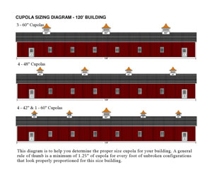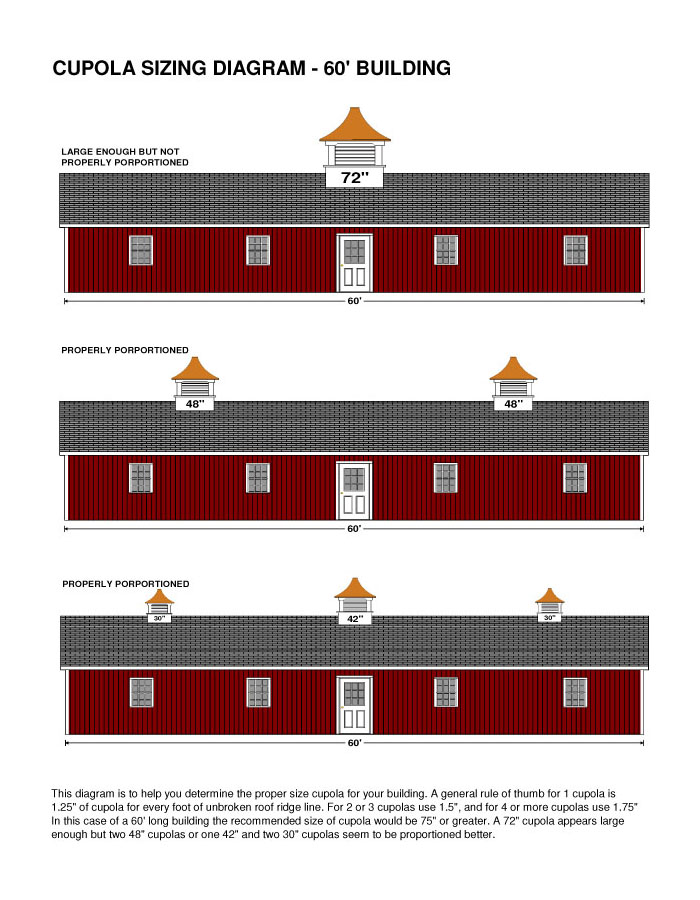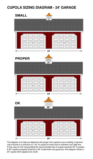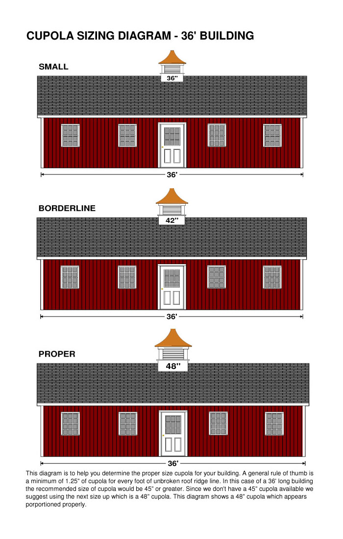 | It's very difficult for an on-line seller to tell you what size cupola to purchase, since it's not possible for us to know what will be aesthetically pleasing to you. If you ask 10 on-line sellers, maybe 8 will blurt out an opinion in the hopes it leads to a sale. I would prefer you first speak with the architect or contractor working on the project. Below is the best we can offer. It should give you a pretty good visual of how the different sizes look on certain buildings. Click the "enlarge" button to see a full size image. I hope it helps.... |