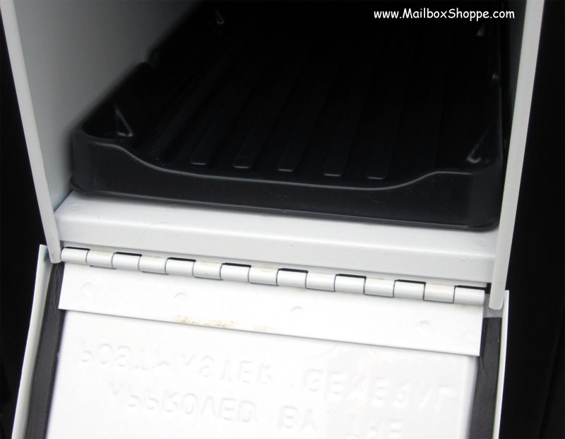 This medium size mailbox has two doors - opens from the front and back. It measures 22"L x 8"W x 10" H. It is made from very sturdy galvanized steel with a powder-coated finish for years of maintenance free use. The doors have a well-designed cast aluminum door pull. The door itself uses a full length stainless steel piano hinge (very nice feature).